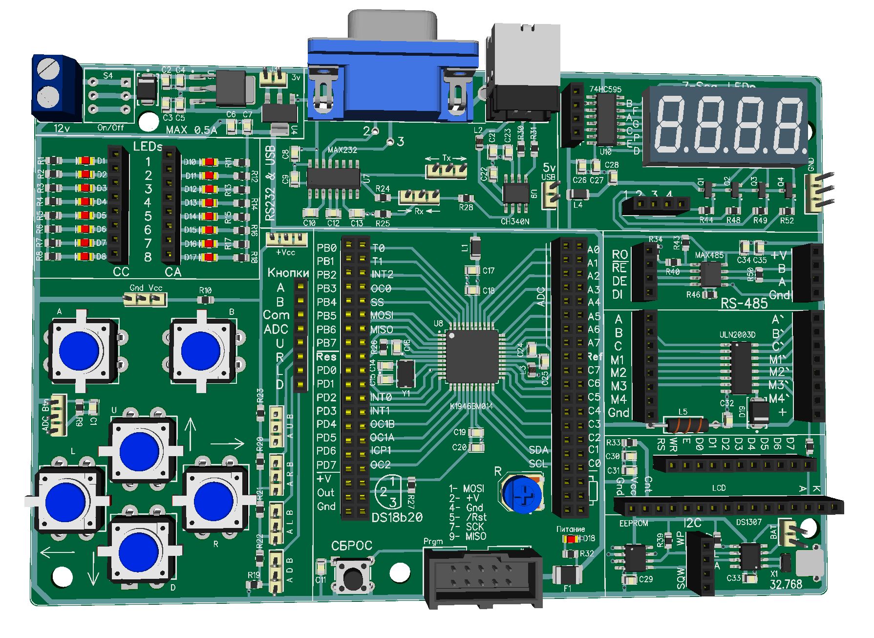 - SPI (2 шт), I2C (2 шт), UART (2 шт), датчик температуры;